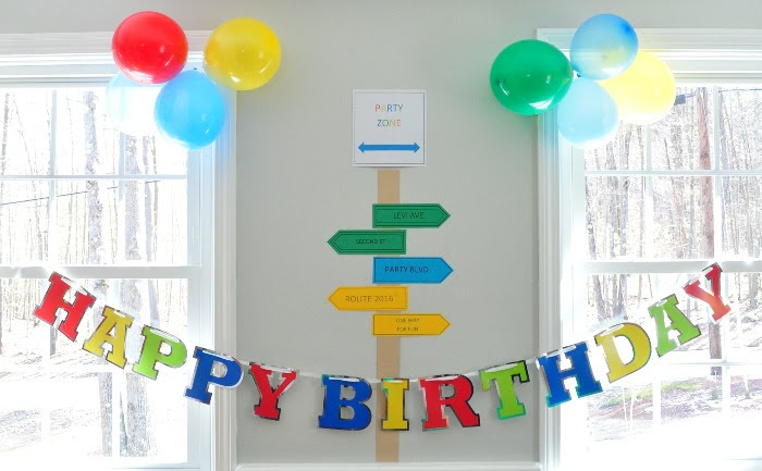 We put the game board flat on the floor to toss the bean bags, but I liked how fun it looked when propped up against the wall. I was originally going to hang it as the backdrop for the birthday boy photos, but then realized that we could make a fun game with it if we could easily move it around. And you've got to have a "Speed Limit 2" sign for your newly minted two year old!